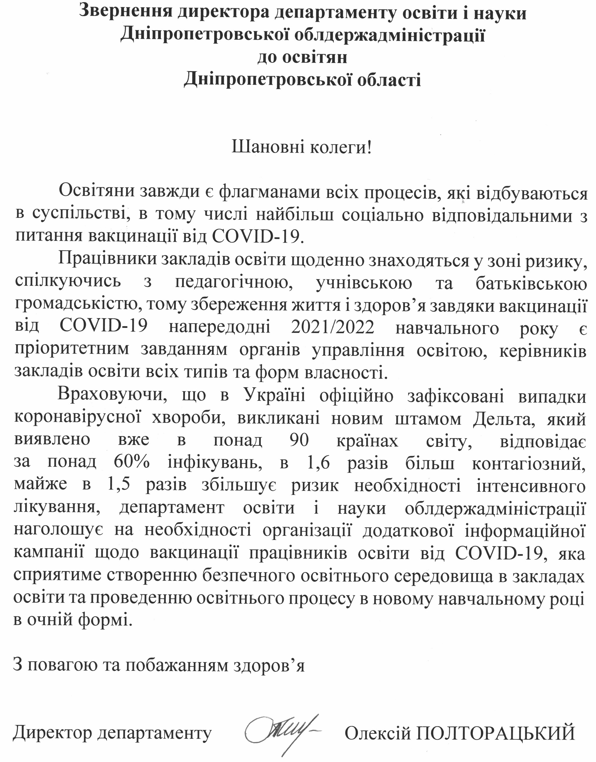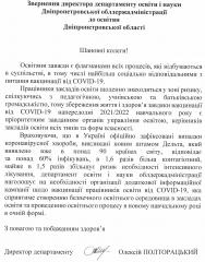 Звернення директора департаменту освіти і науки Дніпропетровської облдержадміністрації до освітян Дніпропетровської області