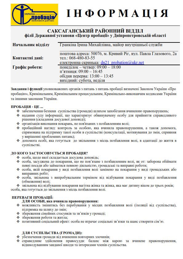 САКСАГАНСЬКИЙ РАЙОННИЙ ВІДДІЛ філії Державної установи «Центр пробації» у Дніпропетровській області