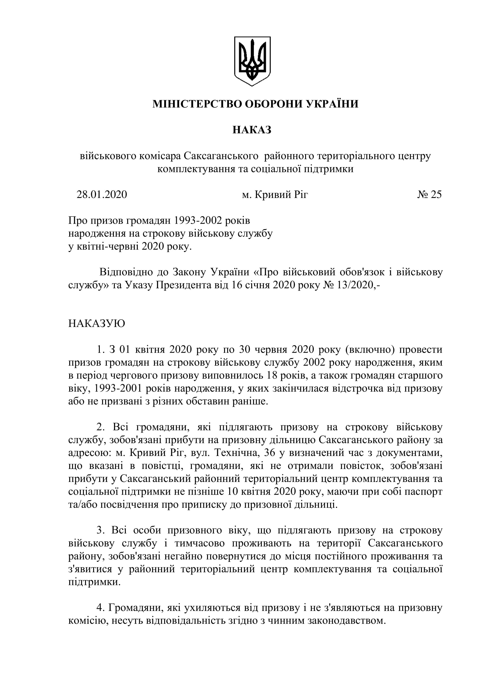 Проведення призову громадян на строкову службу навесні 2020 року