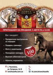 - «Свято на ранчо» – присвячений річниці! До програми входять: святковий виступ на конях, відвідування зоопарку, ослик покатає на бричці найменших учасників, прогулянки на конях, фото з тваринами, тварин можна буде погодувати (бублики-сушка і цукор-рафінад), весь вечір будуть працювати аніматори, запуск величезних мильних бульбашок, можна буде купити і спробувати справжній узбецький плов, а також шашлики, коржі, морозиво, сік.