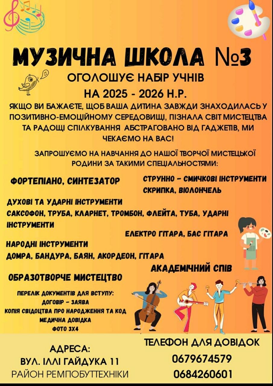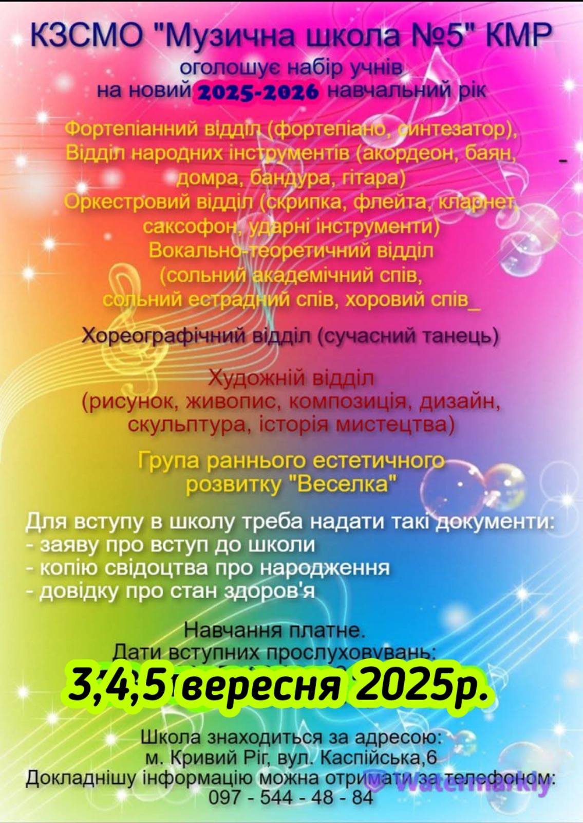 Комунальні заклади спеціалізованої мистецької освіти «Музичні школи № 3, 5, 13» та «Школа мистецтв № 1» Криворізької міської ради запрошують на навчання учнів та пропонують унікальні можливості для дитини: