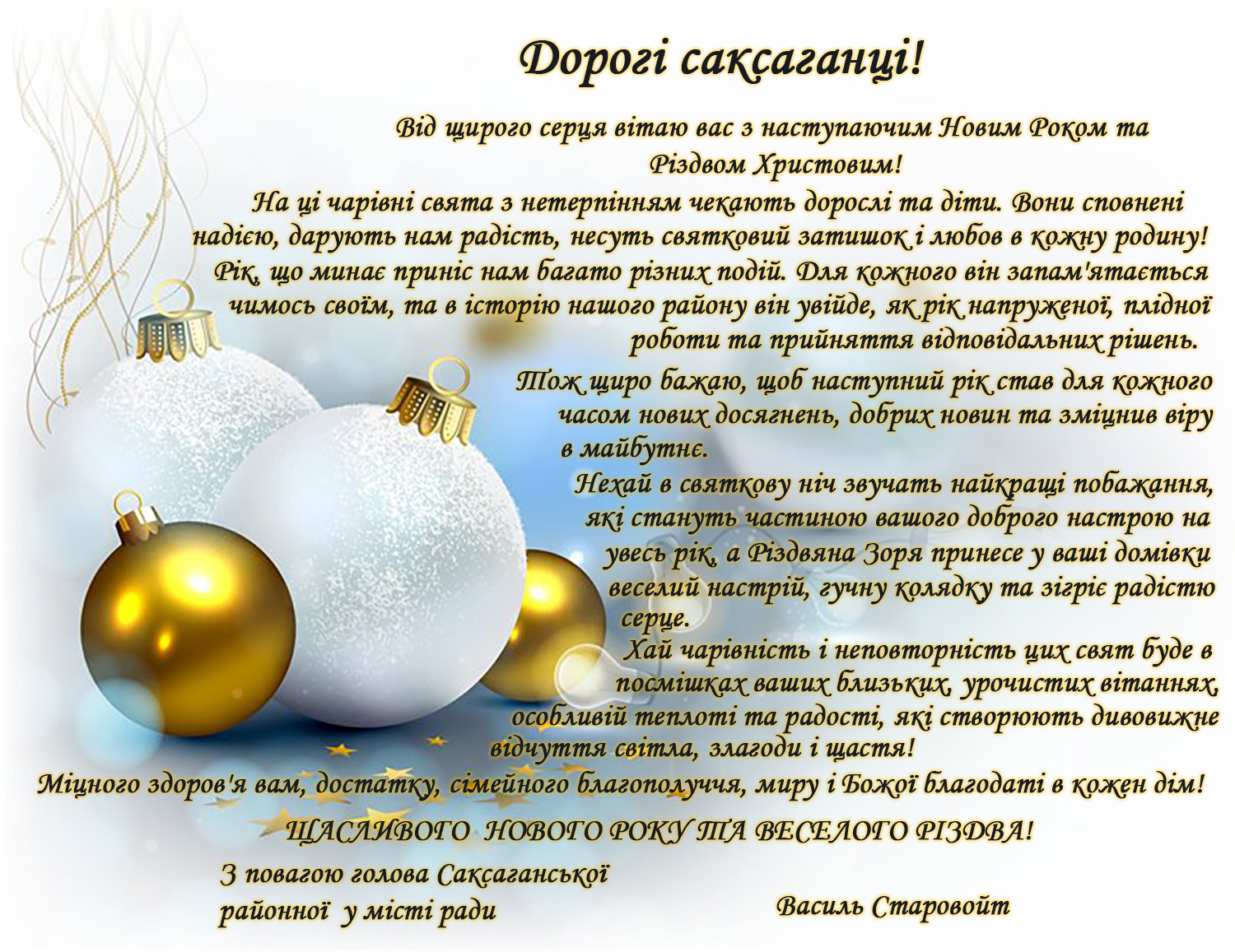 Привітання голови Саксаганської районної у місті ради з наступаючим Новим Роком та Різдвом Христовим.
