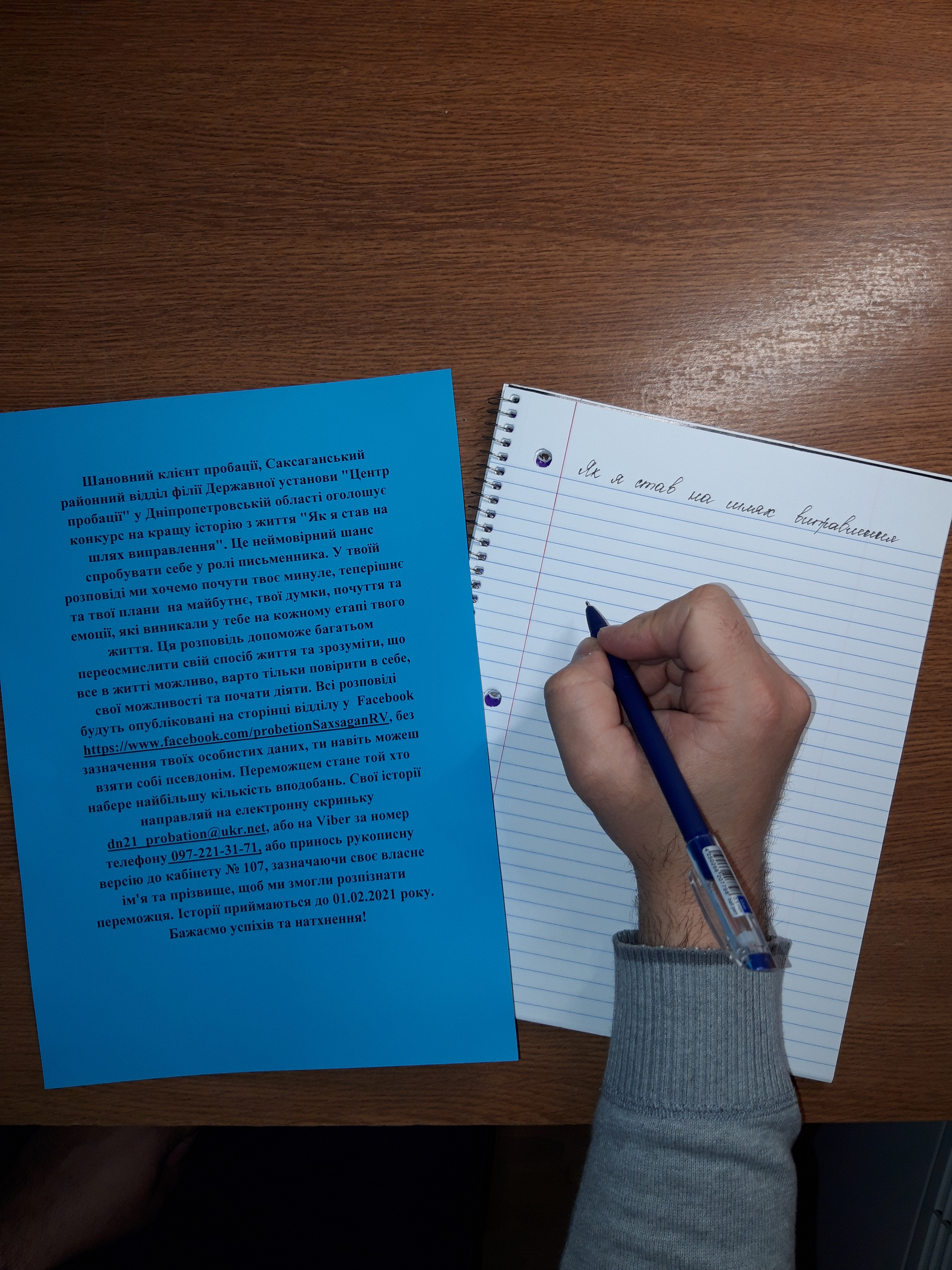 Новий рік в Саксаганському районному відділі філії Державної установи "Центр пробації" у Дніпропетровській області розпочався з нових ідей та проектів, протягом січня 2021 року наші суб'єкти пробації спробували себе у ролі письменників та написали свої життєві історії. Співробітниками відділу комісійно було виділено дві кращі історії, які публікуються на нашій сторінці для подальшого голосування нашими підписниками. Історія яка набере найбільшу кількість вподобань стане переможцем, голосувати можна до 19 лютого 2021 року. Тож залучаємо всіх бажаючих до участі у голосуванні на сторінці відділу у Facebook за посиланням https://www.facebook.com/probetionSaxsaganRV