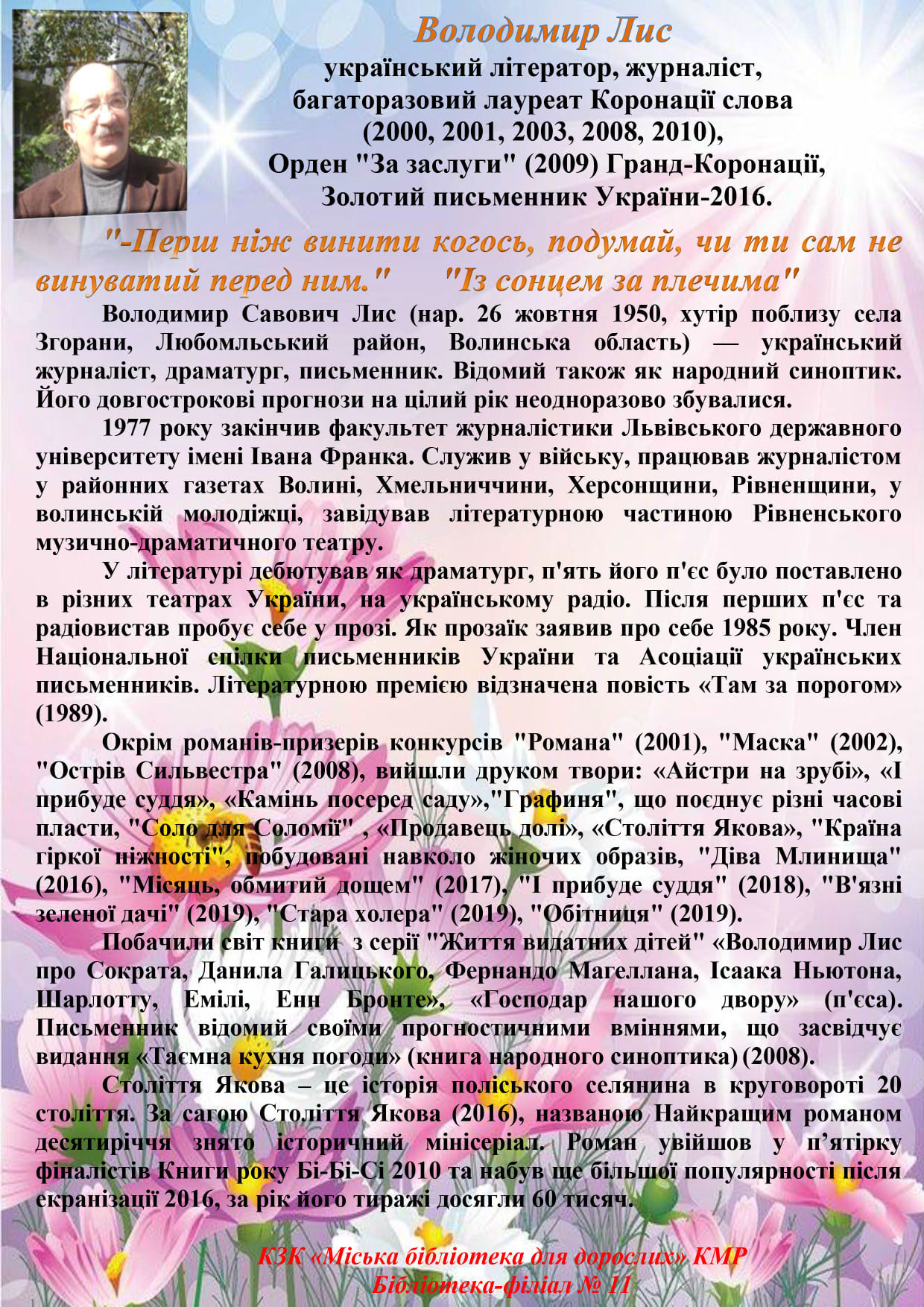 «Від минулого неможливо утекти. Минуле - це ми самі. З нашими успіхами і невдачами, точними попаданнями й помилками». Володимир Лис «Камінь посеред саду». До вашої уваги літературне досьє - Володимир Лис (70 років від дня народження). Прочитати книги ви можете, відвідавши бібліотеку-філіал № 11 КЗК «Міська бібліотека для дорослих» КМР.