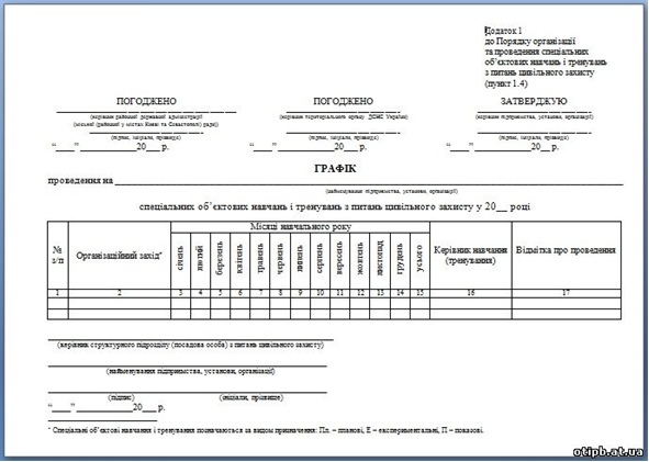 Відповідно до ст. 20 Кодексу Цивільного захисту України суб’єкти господарювання повинні проводити навчання працівників з питань цивільного захисту, в тому числі під час проведення об’єктових тренувань і навчань з питань цивільного захисту. Спеціальні об’єктові тренування та навчання з питань цивільного захисту проводяться щороку відповідно до встановлених вимог та затвердженого графіку. Під час проведення таких навчань або тренувань, працівники підприємства опановують практичні навички щодо дій у випадку загрози або виникнення надзвичайних ситуацій.