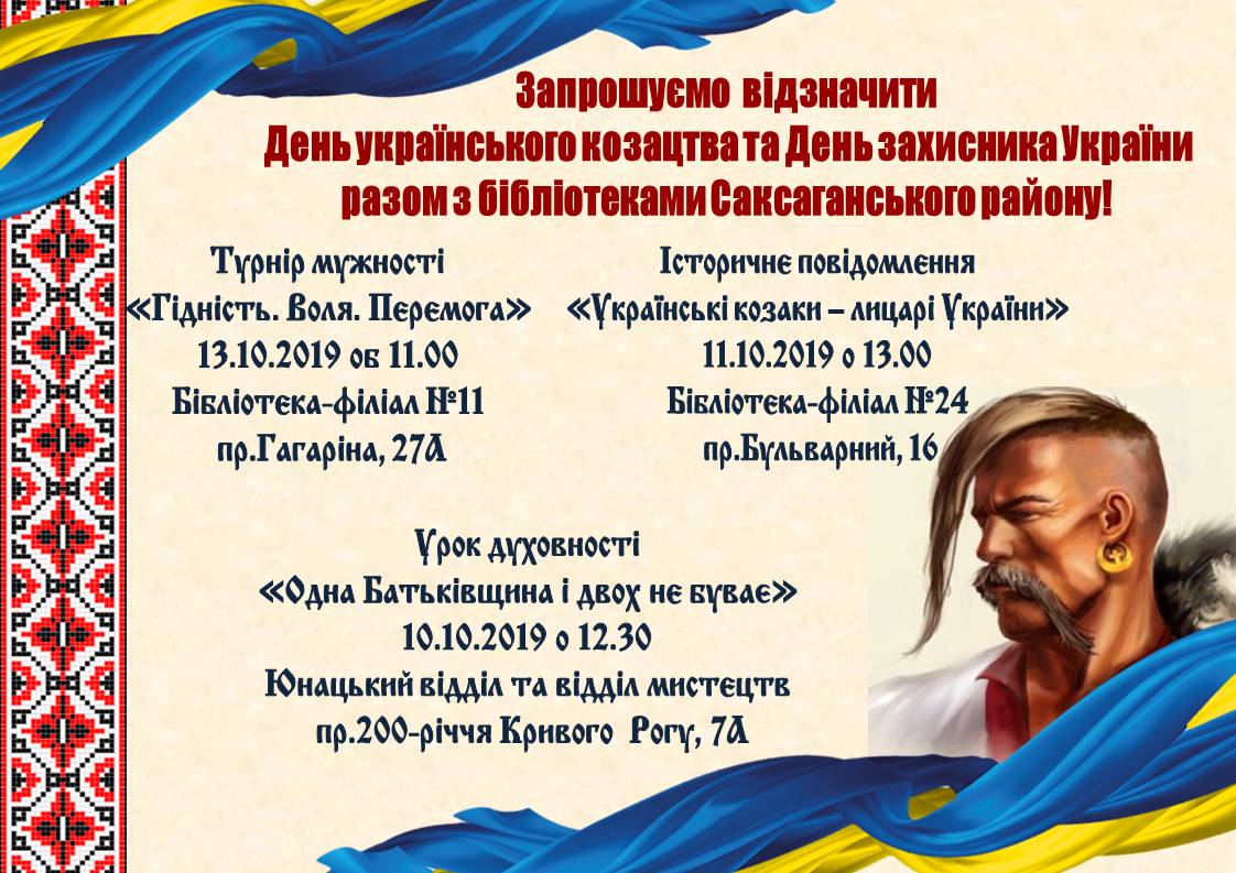 У бібліотеках закладів культури Саксаганського району у жовтні місяці відбудеться цикл культурно-мистецьких заходів до Дня українського козацтва та Дня захисника України.