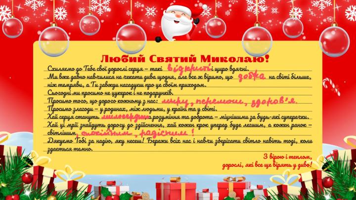 Зустріч пройшла конструктивно та душевно. Справжнім святковим подарунком для всіх стали Миколайчики, які завітали на захід. Вони зворушливо виконали пісню, подарувавши усім атмосферу тепла та передчуття дива. Наприкінець дорослі написали лист Святому Миколаю — слова щирі, добрі, сповнені мрій і побажань миру. І, звісно ж, не залишилися без подарунків: кожен отримав солодощі від Миколая, адже свято зовсім поруч.