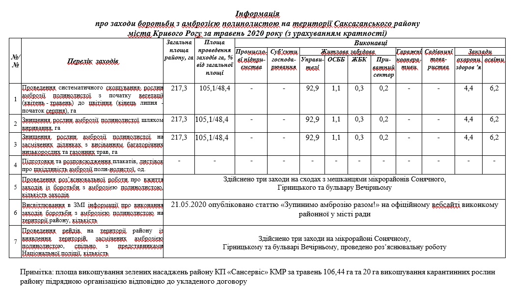 Інформація про заходи боротьби з амброзією полинолистою на території Саксаганського району міста Кривого Рогу за травень 2020 року (з урахуванням кратності)