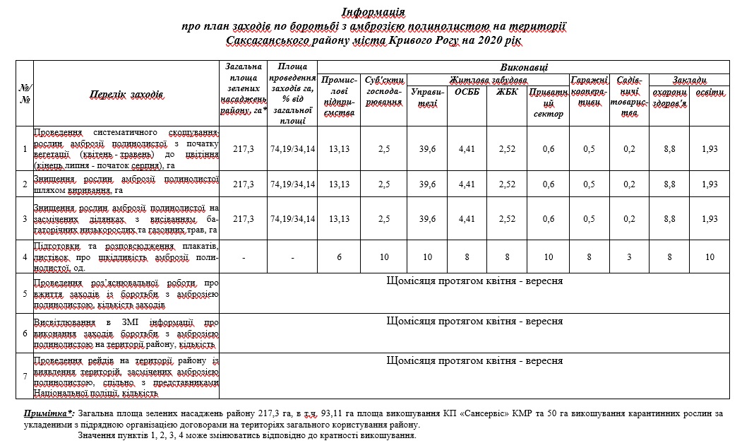Інформація про план заходів по боротьбі з амброзією полинолистою на території Саксаганського району міста Кривого Рогу на 2020 рік